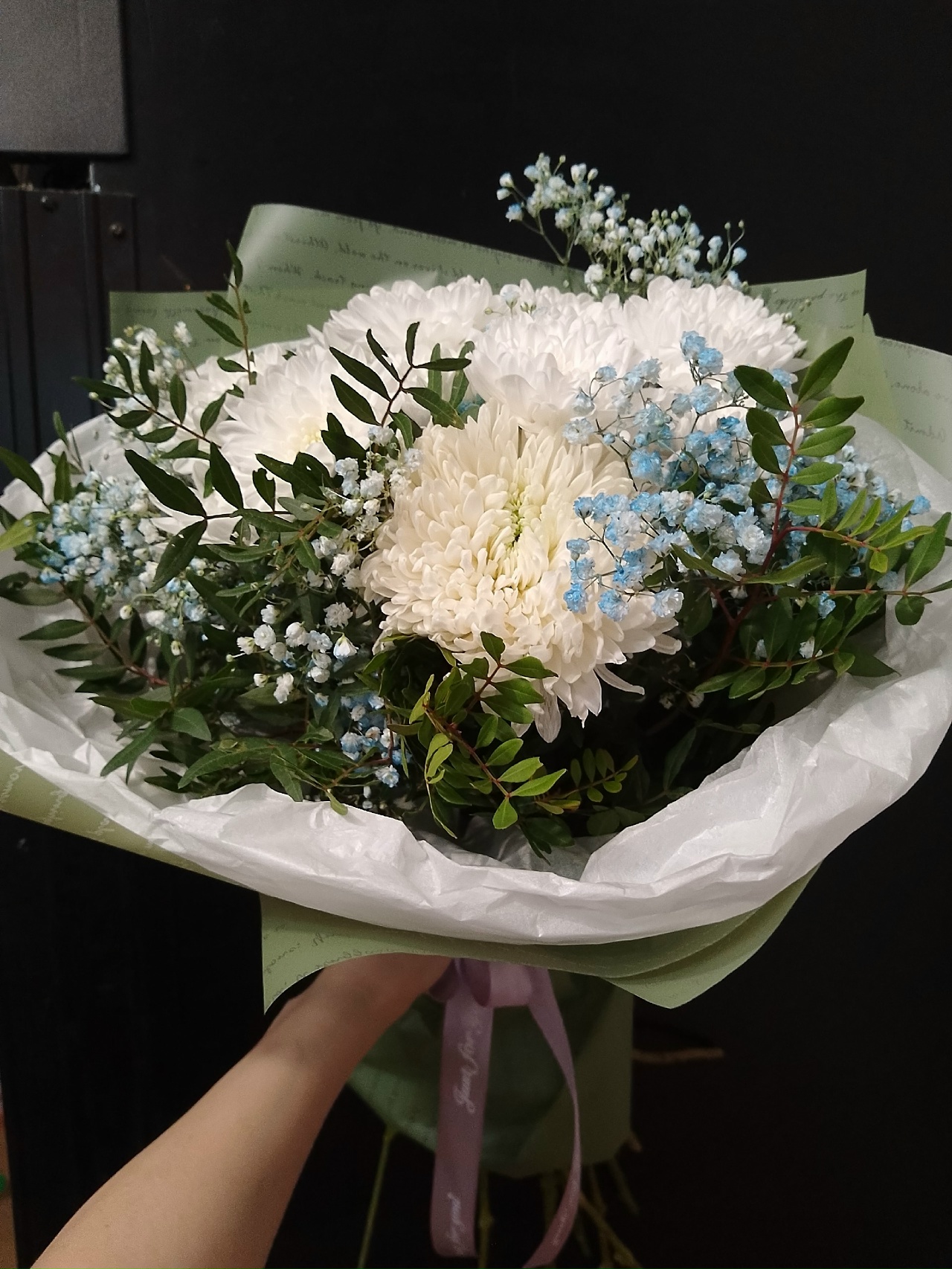 хризантемы 3 шт, гипсофила 3 шт, зелень декоративная 3 шт, упаковка