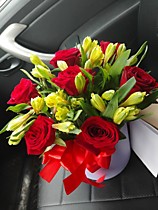 Розы 7 шт, альстромерия 7 шт, коробка, лента, губка флористическая.