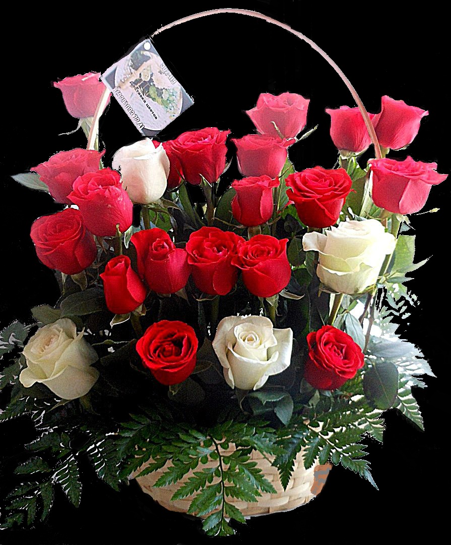 розы 21 шт, папоротник, корзина, флористическая губка