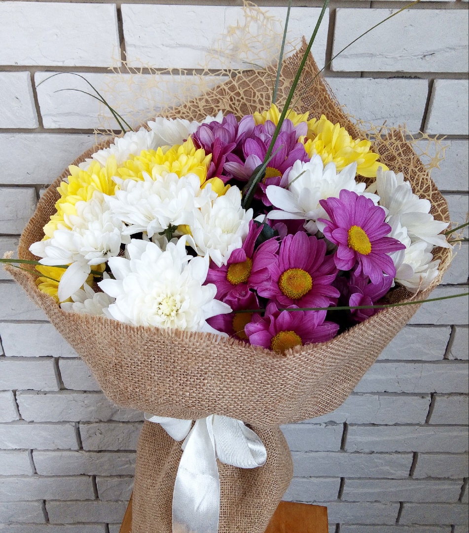 7 хризантем , зелень декоративная, упаковка
