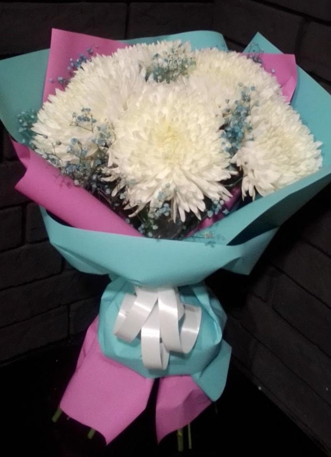 хризантемы одноголовые 5 шт, гипсофила 3 шт, упаковка