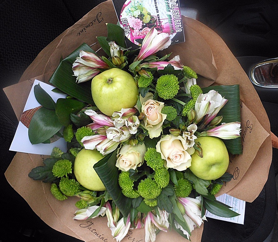 яблоки 3 шт, хризантемы 4 шт, розы 3 шт, альстромерия 3 шт, зелень декоративная 3 шт, упаковка.