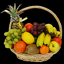 корзина, ананас , виноград, бананы 5 шт, лимон , апельсины 3 шт, мандарины 3 шт, киви 3 шт, яблоки 2 шт
