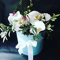 орхидея 7 цветков, зелень декоративная, коробка , губка флористическая