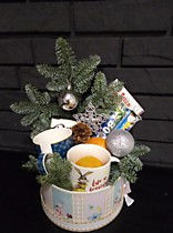 коробка, ель, мандарины 600 гр, кружки 2 шт, шоколад 3 шт, декор новогодний, губка флористическая