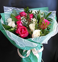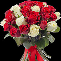 розы 4 шт,зелень декоративная 1 шт, орхидея 1 ветка, упаковка