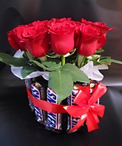 розы 13 шт, шоколад 10 шт, лента, слюда, фетр, картон, флористическая губка