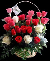 хризантемы кустовые 7 шт, розы 9 шт, рускус 7 шт, гипсофила 3 шт, корзина, флористическая губка