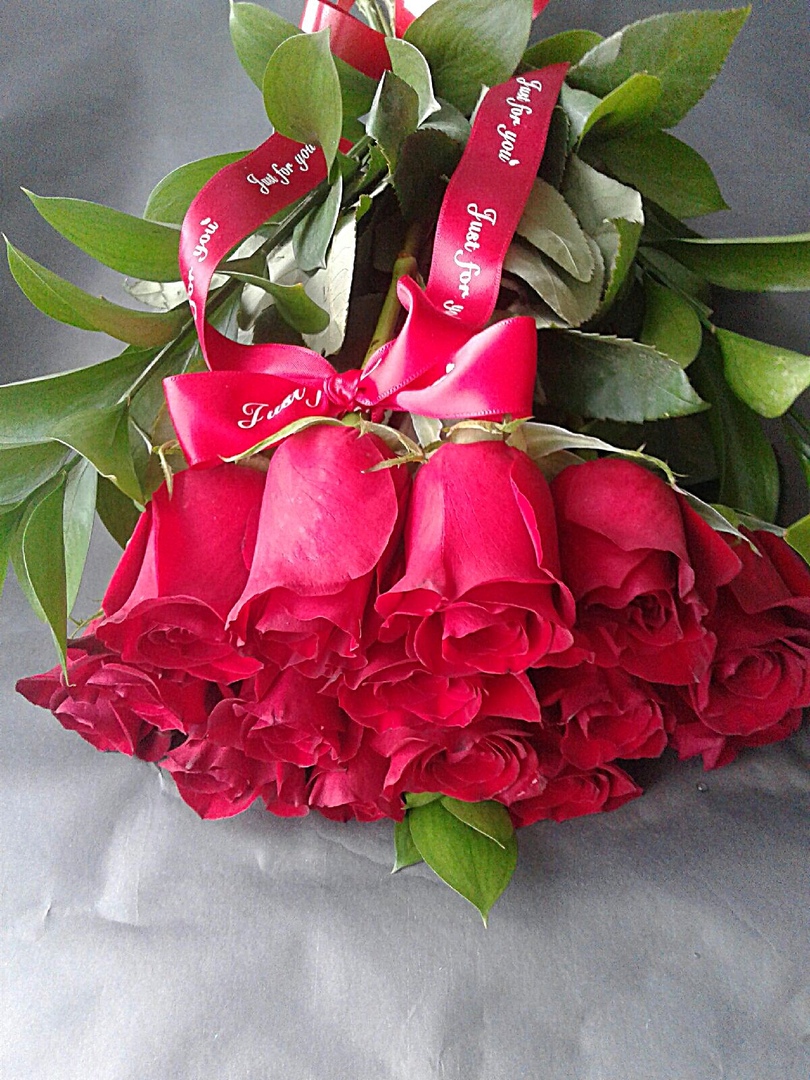 розы 15 шт, зелень декоративная,лента